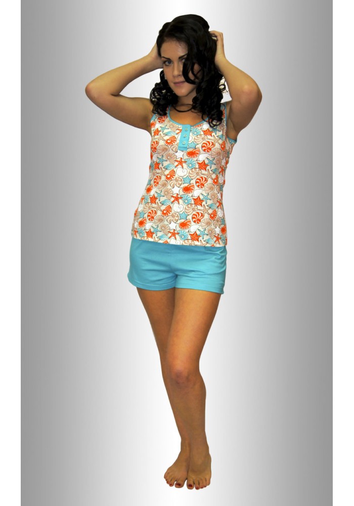Описание: Комплект - шорты голубые, верх - майка, по бокам разрезы, отделка по пройме и горловине, 3 пуговицы на планке