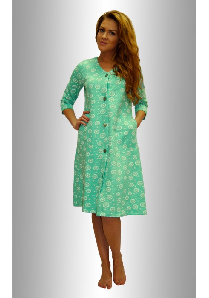 Описание: Халат на на перламутровых пуговицах, с втачными карманами, V-образной горловиной, рукав 3/4