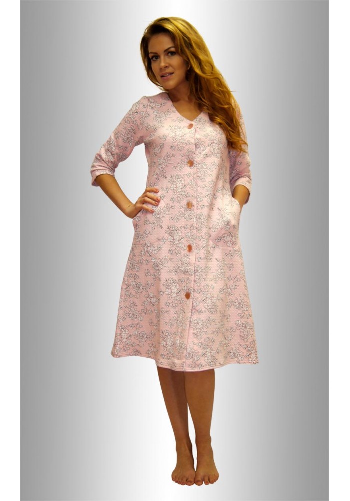 Описание: Халат на на перламутровых пуговицах, с втачными карманами, V-образной горловиной, рукав 3/4